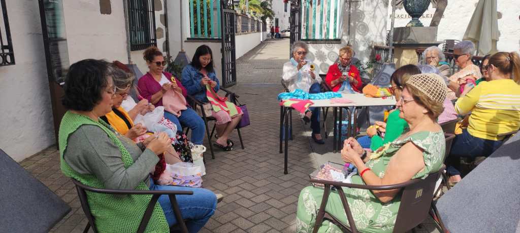 Tejemos en el centro de mayores de Telde los lunes y jueves, de 4 a 6. Durante estas sesiones, compartimos no solo la actividad de tejer, sino también momentos de conversación. Además, cuando hay asamblea lo hacemos en el Molino del Conde, donde discutimos temas importantes y actividades futuras, fomentando así un ambiente de participación activa y comunitaria entre todos.
